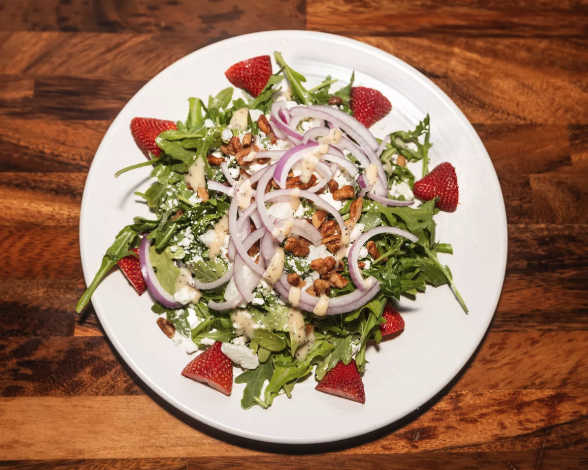 Peppery arugula, strawberries, candied pecans, chenel goat cheese, shaved red onion, honey poppyseed vinaigrette dressing